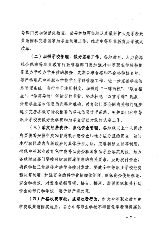 关于扩大中等职业教育免学费政策范围进一步完善国家助学金制度的实施意见